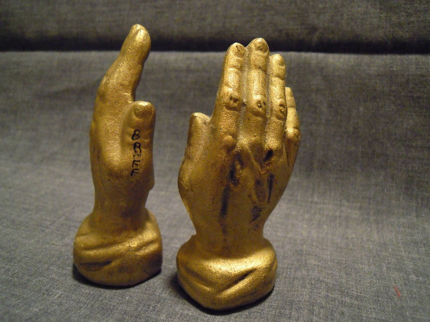 The hands might seem a useful gift on the occasion of someone’s retirement–a cheaper substitute for a golden handshake. In fact, though, if you align them properly in relation to each other, it becomes clear that they are better suited to praying:
