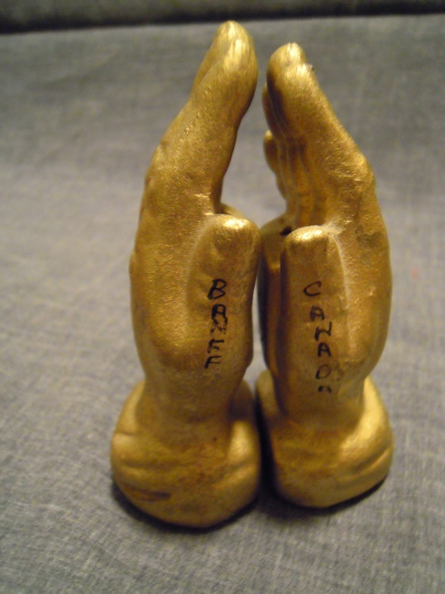 They are, as you can see, golden hands. Or at least gold-painted ones. As you can also see, also, the hands hail from Banff, Canada, the tourist haven in the Rocky Mountains. Or at least, the marking along the thumbs make the claim that they hail from there; the bottoms of the shakers acknowledge their actual origin in Taiwan.