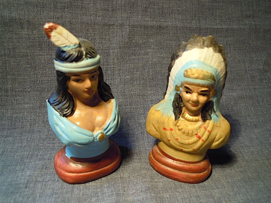 Unlike the sets of salt-and-pepper shakers I’ve been describing in my last five entries, this set does not appear to represent children, and is not particularly cute. The binary opposites are preserved, as they almost always are in the salt-and-pepper world, and it’s still a male and female couple. But the male