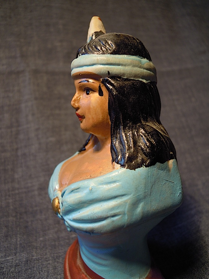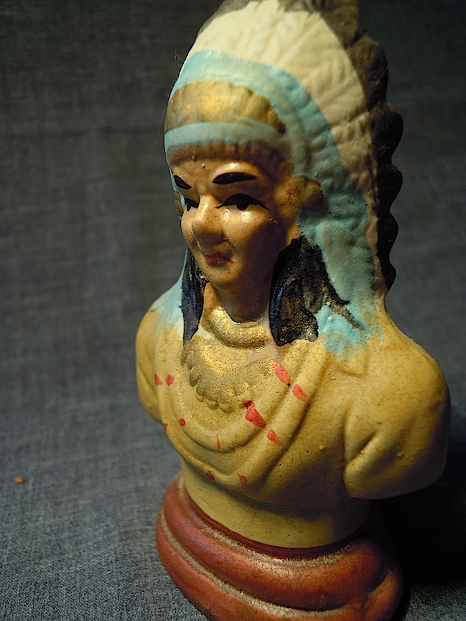 is a noble and fairly serious-looking fellow in a war bonnet and with a prominent nose–a large, often hooked nose often appears in traditional caricatures of aboriginals, as in this portrayal of the redskins of James Barrie’s Neverland in Loisel’s French language bandes dessinées series Peter Pan:
