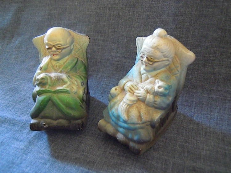 While most of my salt and pepper shakers are made of some sort of earthenware, this pair is plastic. Their bottoms inform me that they were made in Hong Kong.