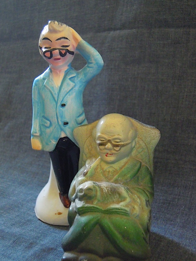 An old woman, also sitting in a rocker, also asleep, and with another animal asleep in her arms, this one probably a cat, although it has a tail more like a squirrel. Her mould is blue. I am suspecting that the mould is actually supposed to represent merely the colours of their housecoats; but in both cases it spreads creepily into their skin and hair, and thus creates something of a horror-movie effect, a kind of spreading plague–the dog and the cat are catching it, too. Both the old man and the old woman wear the stereotypical glasses that can be peered over the top of, and thus help the pair to represent a satisfactorily recognizable caricature of what it means to be old. Perhaps the plague is simply age itself, the process of growing into a mouldy oldie? So much for