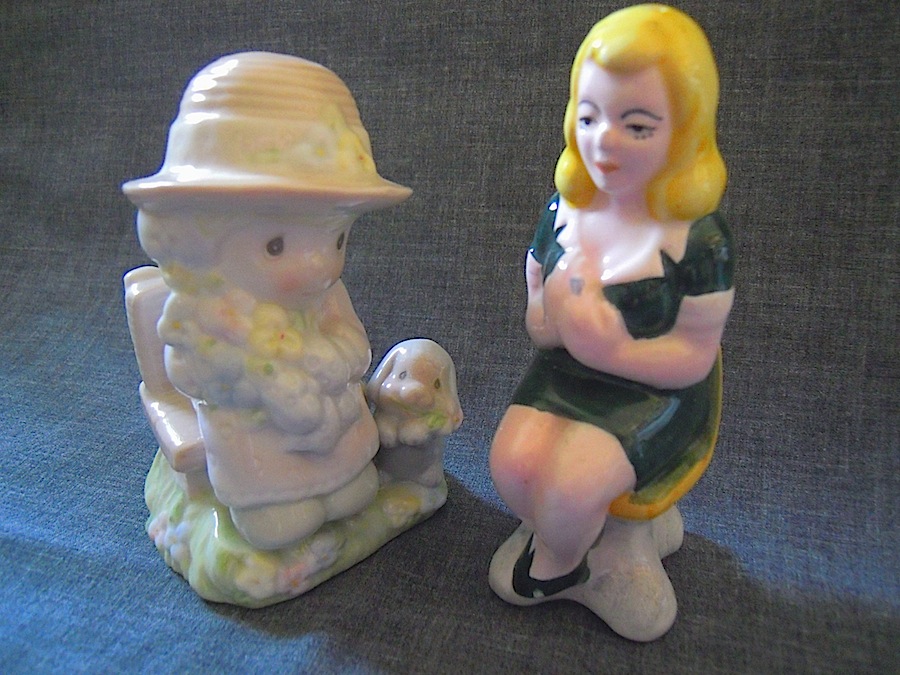 I bought the typist and her desk at a little shop in the Camden Passage antique market in Islington, near the Angel tube stop in London.  I was surprised to see her there, for I’ve looked for novelty salt-and-pepper shakers at various places in London and elsewhere in the UK, and never actually seen any.  I’ve assumed, then, that the novelty salt-and-pepper shaker set market was mostly restricted to Canada and the U.S–a North American phenomenon.   But if that’s the case, what was the typist doing on the wrong  side of the Atlantic?