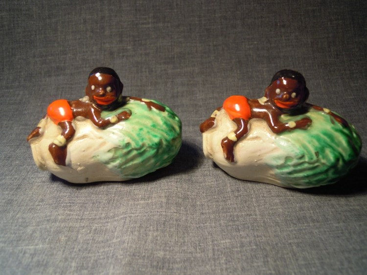 They are, clearly another pair of black stereotypes–they have the usual thick red lips and round white eyes, a la the Aunt Jemima of my last few posts. But they are not, this time, African American stereotypes, or if they are I have no idea about why they might have climbed on top of a pair of what appear to be Chinese cabbages. Is it some sort of cabbage race? Are the vegetable-like things they are climbing on meant to be Sui Choy, or are they some stubby form of Bok Choy? Are the human figures on the vegetables meant to be Indians or Sri Lankans, perhaps? Why else are they reclining on Asian vegetables? Might they be African boat people on a slow boat to China? I have a feeling there is possibly a bug metaphor in play–but it’s just a feeling. So this is another pair which remain a strange mystery to me. Someone apparently thought there was a market for these, an audience that knew some phrase or something through the lens of which which they could view these shakers. I am not in that audience. If anyone who is could give a hand, I’d be grateful.