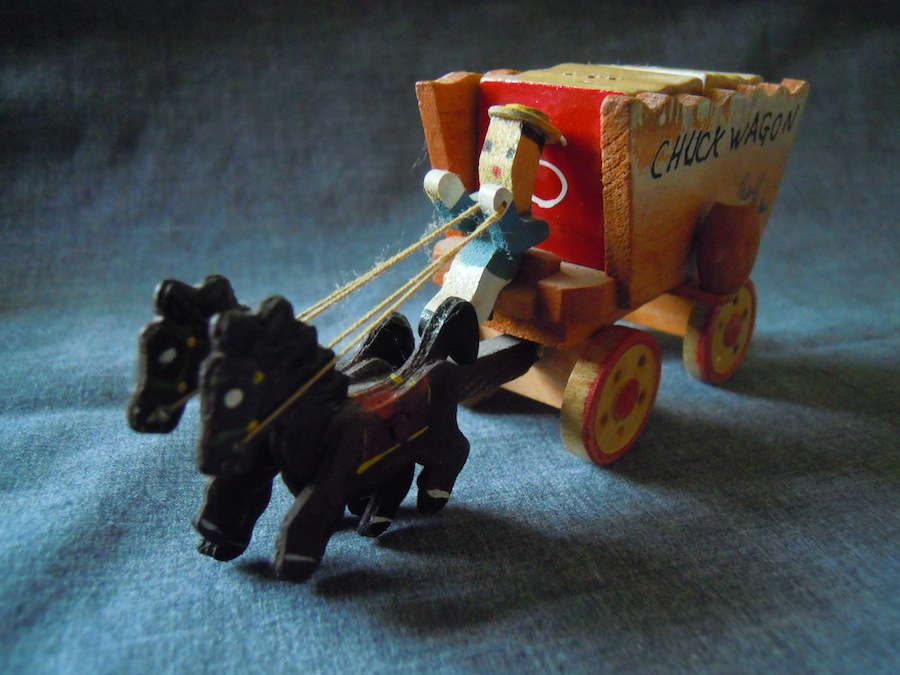 This chuck wagon is made of wood, in a pleasingly primitive style of carving, and has a very simply outlined driver, who, despite his simple outlines, manages quite successfully to communicate the actions of a driver on the go: