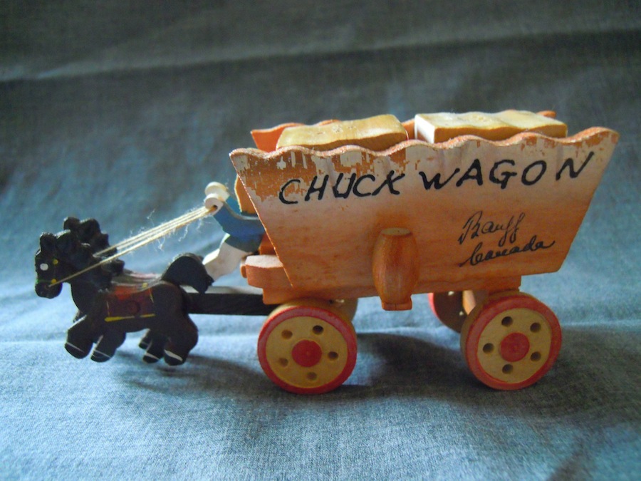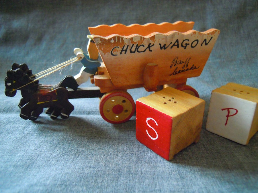 Well, perhaps it’s not so odd–at least not so odd as the lion and his/her friend: for after all, Banff is not all that far from Calgary, where they have chuckwagon races at the annual Stampede. But that’s far enough away to be down on the prairies–it’s harder to imagine those wagons racing around right in the shadow of the Rockies that surround Banff itself. And are there not shaker souvenirs of Banff that do in fact in some way evoke these mountains? So far, at least, I don’t have such a set.