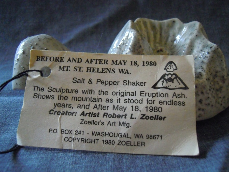 Now it becomes clear that this set is an attempt at an accurate representation of Mt. St. Helen’s. One piece represents the top of the mountain, as blown off in the 1980 eruption. The other represents what was left after that top was blown off. Or in other words, this is a before-and-after set: the two pieces placed on top of each other represent what the mountain looked like before the eruption, the bottom piece on its own after you remove the top what it looked like after. The movement of a user in choosing to pick up one or the other shakers in order to season some food then replicates the action of Mother Nature in blowing the top off the mountain. You salt your food and you make a volcano happen.