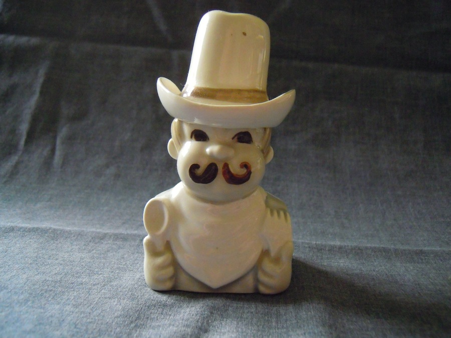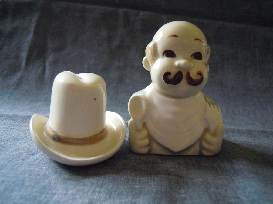 This nesting and/or stacking represents a fairly prevalent ingenuity factor in salt and pepper sets–a way in which they do something more than just represent something–something physical that makes their connection with each other kind of clever and also, (here’s the word again) kind of cute. Because it’s cute that your pepper shaker would sit on the head of your salt shaker, especially since one is a hat and the other is a head. I mean, who woulda thunk it, eh? And yet, once you do think about it, so obvious and apropos. The hat actually comes off the head, just like a real hat. So gosh darned, all-fired adorable. It’s yet another aspect of the set that encourages a kind of response to the set’s adorable novelty (as in, .e.g. the whole idea of novelty salt and pepper shaker sets in general, that they are novel, unusual). This is an invited response that is both approving of it and, at the same time, more than a little dismissive. Why dismissive? Because the ingenuity is so completely and entirely pointless, and really, so completely and entirely without any sort of significance, so entirely self-contained. The hat sits on the head because the hat sits on the head, and for no other more practical or useful purpose–because hats in reality do sit on heads, and wouldn’t it be cute and sort of clever to represent that in miniature earthenware? It’s another aspect of the set that makes it little and safe, and admirable in its littleness and safeness.