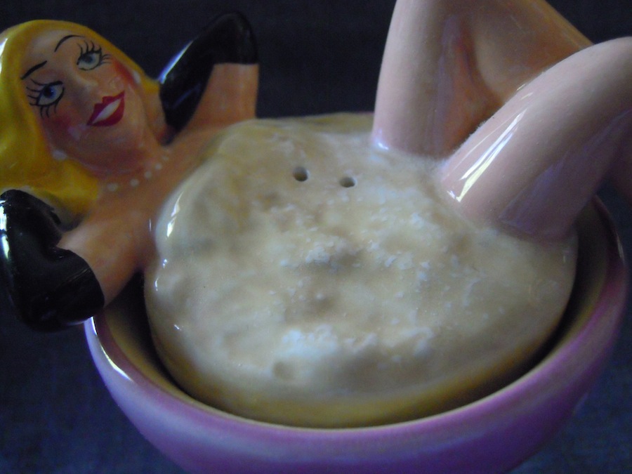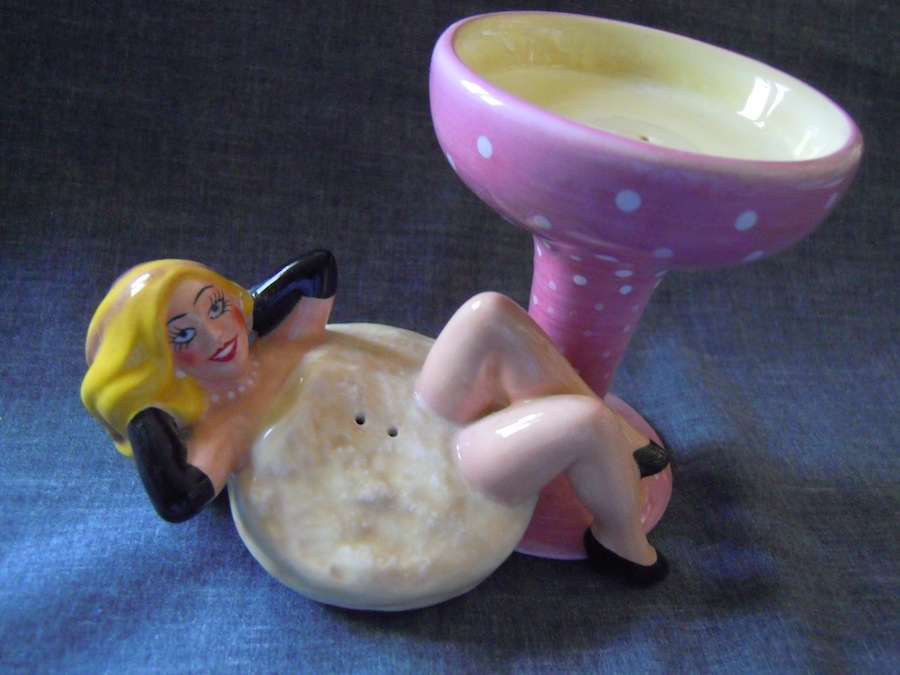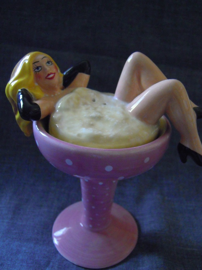 It represents a young woman in a cocktail glass–either a very tiny young woman or a very huge cocktail glass. Or wait, maybe it’s not actually meant to be a cocktail glass, but just in the shape of one–for few cocktail glasses are opaque mauve with white dots. So maybe it’s just a sizeable mauve bathroom sink, or small bathtub on a pedestal. One way or the other, though, it seems to signify the frivolity and lightedheadedness of champagne and jazzy nightclubs, a gay life in a different time when gay meant something different than it does now. So the set is, I suppose a kind of old-fashioned symbol of a sophisticated (or sex-crazed) life of wild abandon, a Playboy or even older and better, Esquire magazine lifestyle. Exotic cocktails and tempting wide-eyed blondes wearing nothing but long black gloves, high heels, and soap/champagne bubbles. What the with-it crowd in the Big Apple was supposedly up to as represented for the little old ladies and gentlemen of Dubuque.