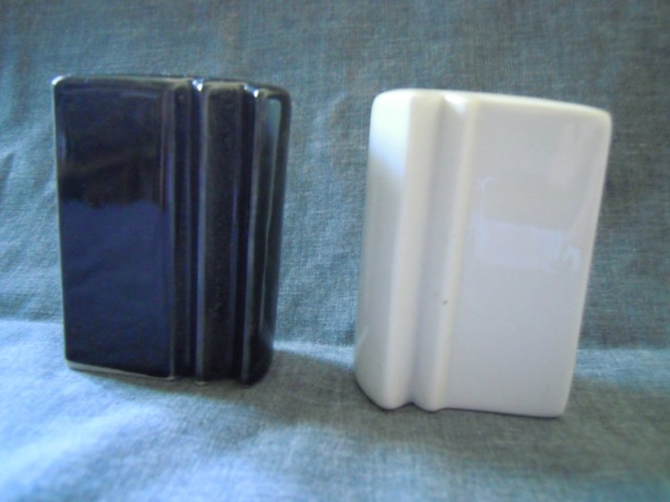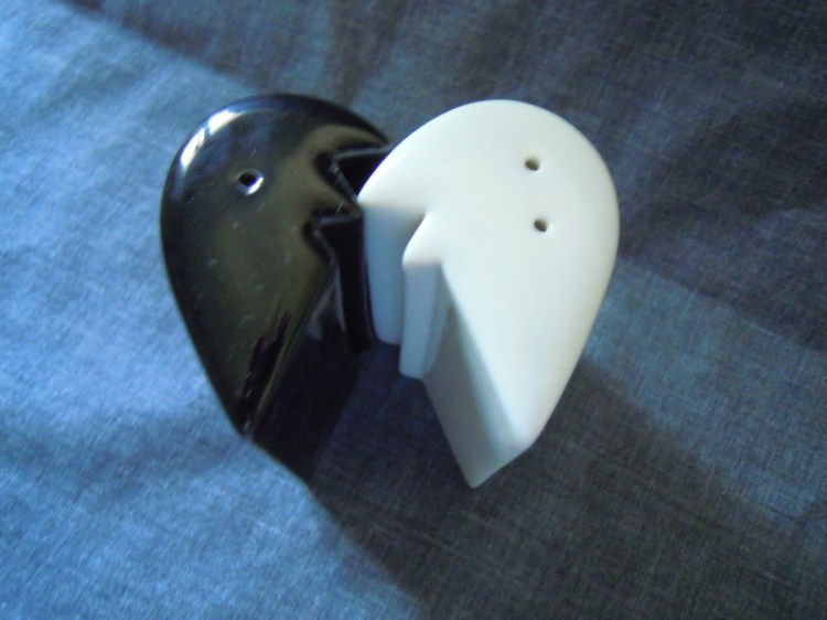 In that earlier post on mixed-race shakers, I considered a set of two figures, one black and one white, that can be placed in such a way that they appear to be hugging each other–and when they do, they form a Yin/Yang symbol when viewed from above. Here’s another set that utilizes a similar idea. Apart, they are just oddly jagged shapes, one black, one white.