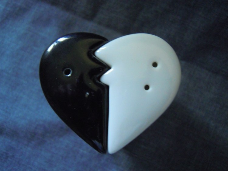 And yet: they are still clearly marked by their original separation and opposition: one half of the heart is still black, the other still white. And come to think of it, one might just as easily read the implied script as the reverse of coming together: indeed, in terms of how Robin Bernstein deploys her concept of scriptive things, that seems even more logical. As one chooses to use either the salt or the pepper, one pulls the heart apart, separates the black and the white from each other.