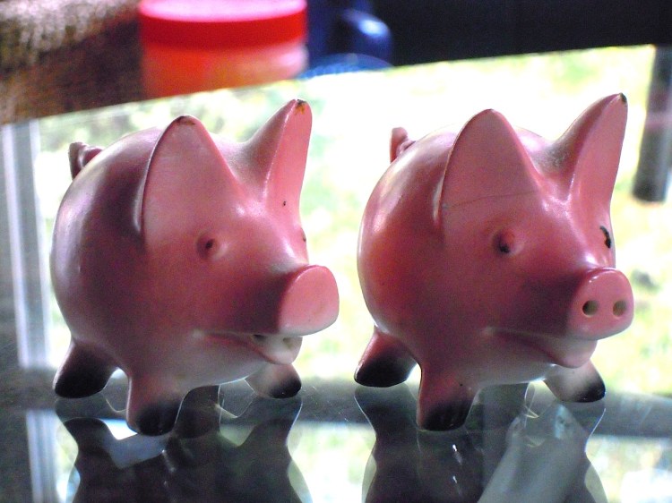 The question remains the same. Generally speaking, what actions or responses do novelty salt and pepper shakers invite when they appear as part of a table setting for a meal? Most obviously of course, they invite those at the table to shake them, i.e., to put salt and/or pepper on their food–and whatever kind of shakers they are, plain or fancy, they bring with them the range of implications and invite something like the kinds of responses I’ve tried to outline in my last few posts. But in addition to all that, their novelty aspects add yet more nuances. In order to explore those in as non-specific a way as possible, I’ve chosen a set of shakers that are even less distinct or unusual than the pair of bear of my last post. This time it’s pigs: