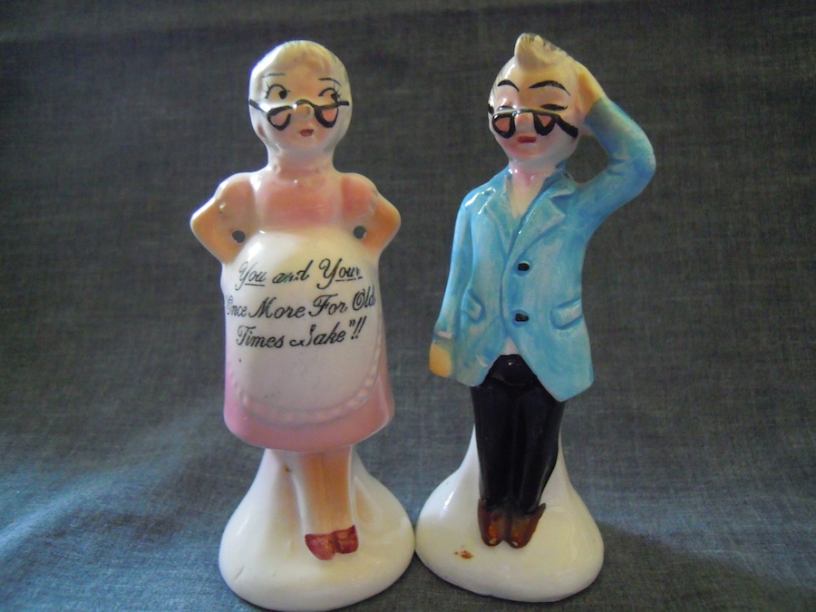 So it’s the same couple, apparently–but in this earlier shaker set they’re standing, and in the new one I just purchased recently they’re sitting down.