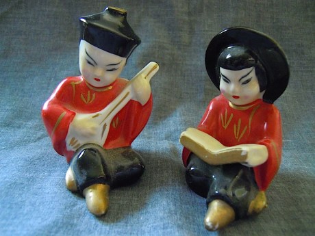 This set sums up one significant branch of the Asian world as it is depicted in salt and pepper sets: the sensitive aesthete stereotype (the other main branch has to do with cooking, especially Chinese cooking–more of that in a later post). This is one of two similar sets I own that depicts a couple seated on the ground as they play their artistic trades–here, playing a stringed instrument and just plain reading. I’ll talk about the second set in my next post.