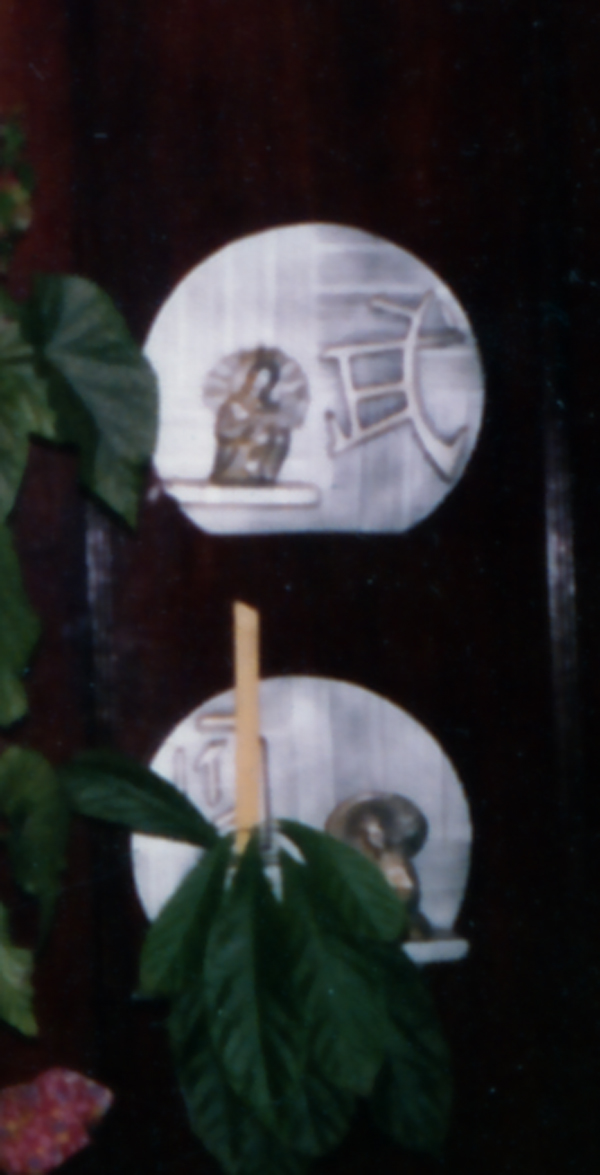 The figures are seated on the ground, under umbrellas, reading. I have no idea what, if anything, the symbols beside them mean–although they do sort of look like Japanese letters. These plaques were originally, as far as I can recall, primarily, black, with gold highlights; my father, who had something of a fetish for house paint and a lifelong urge to paint each and everything that came anywhere close to him (even, sometimes his children as he was busy painting other things), painted them silver as they appear in these pictures.