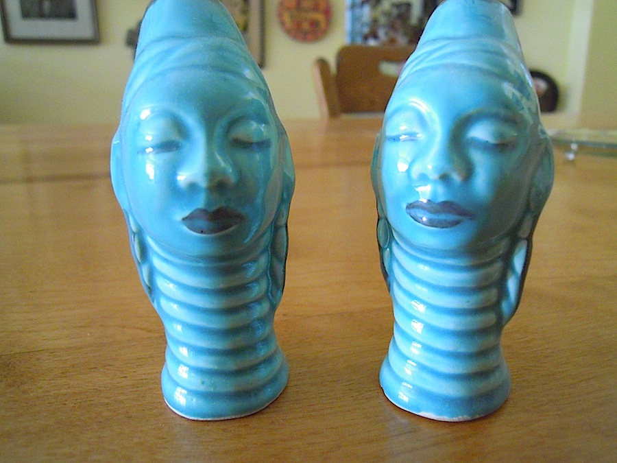 So why are my shakers blue? Good question–and one for which I really don’t have an answer. Except, of course, that it makes the women depicted yet more exotic, yet more alien (and these shakers were, I’m sure, made long before the James Cameron movie Avatar raised blue exotica to new heights and new popular acceptability).