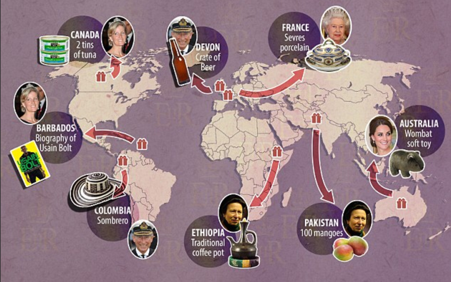 “Tins of tuna, woolly hats and a model of a surface to air MISSILE: The lavish (and often bizarre) gifts given to the Queen and other royals in 2014 revealed.” Daily Mail, January 14, 2015. http://www.dailymail.co.uk/femail/article-2909637/The-lavish-bizarre-gifts-given-Queen-royals-2014-revealed.html#ixzz4QmFnCev8