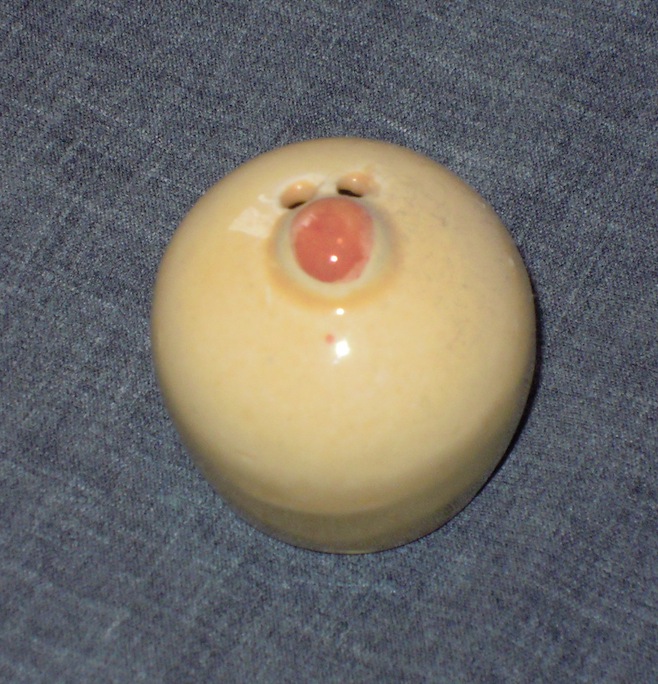 Not faces at all, it seems. Breasts. Detachable breasts that detach from a body with no head and no arms. The ultimate realization of mid-Victorian or early adolescent male fantasies about the ideal woman with breasts like weather balloons, the always available bolster cushion that doesn’t ever talk or complain or say “No” and who just lies there and does it for the Empire? It’s the ultimate no-fuss collection of usefully and conveniently separable body parts. It’s the ultimate expression of breast fetishism. It is, I think, the most disturbing slat-and-pepper set I have in my collection. Looking at it too much could give you nightmares. Thinking about it too much could turn even the Hugh-Hefner-approved version of a playboy into a feminist. Or maybe a serial rapist. I mean more of a serial rapist.