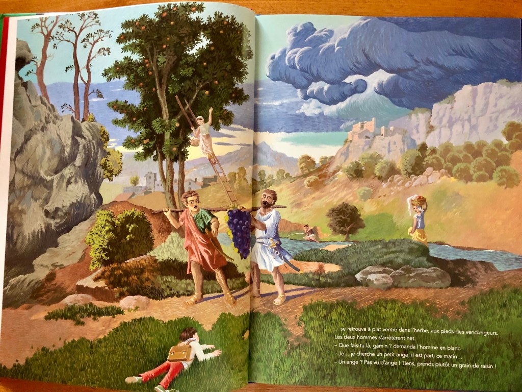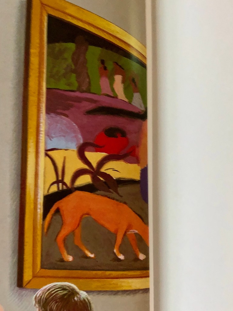 As I continue to work on my project of exploring children’s picture books that describe young people and young animals visiting art museums, I’ve come across an interesting French book, L’Ange Disparu, by Max Ducos (2008), in which a woman in one of the paintings asks a bored boy on a school tour to help find her “ange,” who has escaped from the painting and is at large in the museum (This is one of almost thirty picture books I’ve found that describe figures from paintings entering galleries or gallery-goers entering paintings).