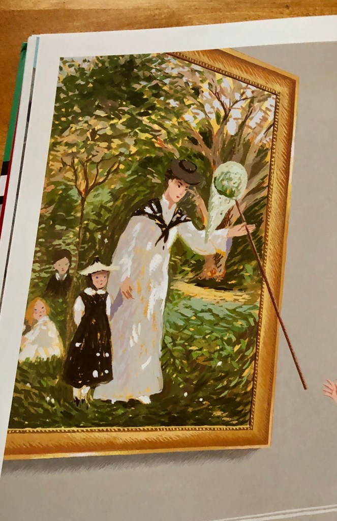 Some are fairly easy to identify. For instance, the boy visiting the gallery enters a painting as shown here: